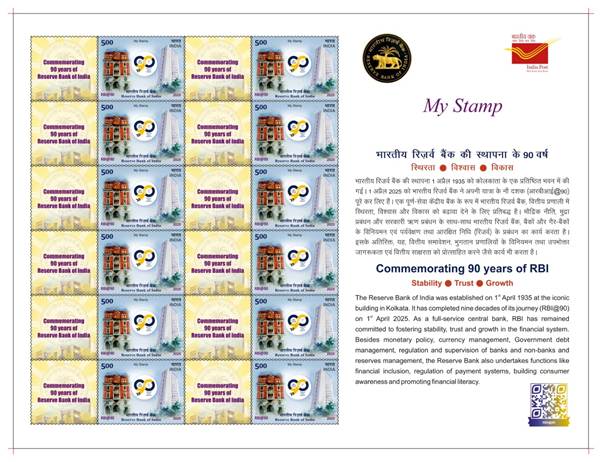 The special postage stamp released on this occasion depicts RBI’s iconic heritage, symbolising its journey of nine decades. The stamp prominently showcases the Reserve Bank’s original headquarters in Kolkata, where it was first established, along with its present headquarters in Mumbai, representing its evolution over the years. It also prominently displays the RBI’s specially designed 90-year logo with the inscription “Stability. Trust. Growth”, reflecting its foundational principles and continued contribution to the economic framework of the nation.