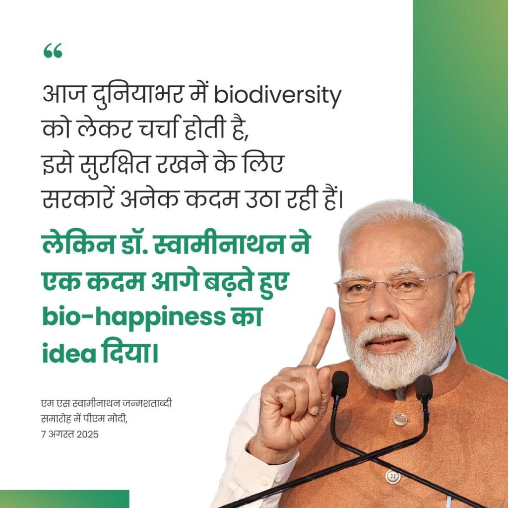 प्रधानमंत्री ने कहा कि जैव विविधता वैश्विक चर्चा का विषय है और सरकारें इसे संरक्षित करने के लिए विभिन्न कदम उठा रही हैं, लेकिन डॉ. एमएस स्वामीनाथन ने जैव-सुख के विचार को प्रस्तुत करके एक कदम आगे बढ़ाया। उन्होंने कहा कि आज का यह आयोजन इसी विचार का उत्सव है। डॉ. स्वामीनाथन के विचार जैव विविधता की शक्ति स्थानीय समुदायों के जीवन में क्रांतिकारी बदलाव ला सकती है, का उद्धरण देते हुए, श्री मोदी ने कहा कि स्थानीय संसाधनों के उपयोग से लोगों के लिए आजीविका के नए अवसरों का सृजन किया जा सकता है। उन्होंने कहा कि अपने स्वभाव के अनुरूप, डॉ. स्वामीनाथन में विचारों को जमीनी स्तर पर क्रियान्वित करने की अद्वितीय क्षमता थी। प्रधानमंत्री ने कहा कि अपने अनुसंधान प्रतिष्ठान के माध्यम से, डॉ. स्वामीनाथन ने निरंतर रूप से यह सुनिश्चित करने के लिए कार्य किया कि नई खोजों का लाभ किसानों तक पहुंचे। उन्होंने कहा कि छोटे किसानों, मछुआरों और जनजातीय समुदायों को डॉ. स्वामीनाथन के प्रयासों से बहुत लाभ हुआ।