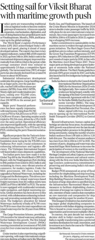 नई दिल्ली : प्रधानमंत्री श्री नरेन्द्र मोदी ने आज एक लेख साझा किया। इस लेख में बताया गया है कि भारत के बंदरगाह विस्तार, मशीनीकरण, डिजिटलीकरण और व्यापार में सुगमता के माध्यम से वैश्विक वाणिज्य केन्द्रों के रूप में विकसित हो रहे हैं।