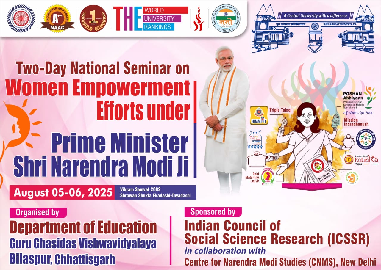 Nai Dilli : The Department of Education, Guru Ghasidas Vishwavidyala, Bilaspur ,Chhattisgarh host the ICSSR Sponsored National Seminar on ” Women Empowerment Efforts under Prime Minister Shri Narendra Modi ji ” In Collaboration with Centre for Narendra Modi Studies (CNMS) Bharat.